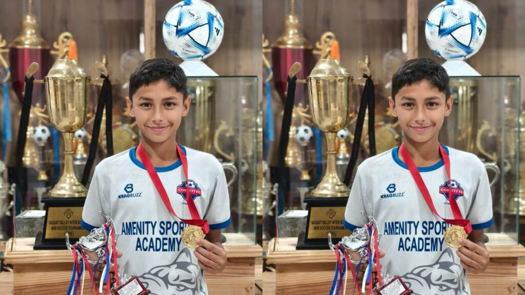 नैनीताल/रुद्रपुर।अमेनिटी पब्लिक स्कूल, रुद्रपुर की फुटबॉल टीम ने दिल्ली में आयोजित 24वें वसंत वैली मिनी फुटबॉल टूर्नामेंट में शानदार खेल का प्रदर्शन करते हुए कप अपने नाम किया।जिसमें नैनीताल के भारतीय शहीद सैनिक विद्यालय के शिक्षक व बच्चो को फुटबॉल की मुफ्त कोचिंग देने वाले कोच गोविंद बोरा के पुत्र गौरांश बोरा के अद्भुत प्रदर्शन ने सबको चकित कर दिया, जिन्हें पूरे टूर्नामेंट में टॉप स्कोरर का खिताब दिया गया। इसके अलावा, गोलकीपर वेदांश मिश्रा ने भी अपनी बेहतरीन गोलकीपिंग से टीम की जीत में महत्वपूर्ण योगदान दिया। गौरांश ने कुल 24 गोल दागे।जीत के बाद स्कूल के प्रबंधक सुभाष अरोड़ा व प्रधानाचार्य इंद्रा त्रिपाठी सहित अन्य स्टाफ ने टीम व गौरांश बोरा को बधाई व शुभकामनाएं दी है।