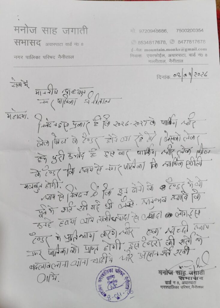 नैनीताल। नगर पालिका ने पार्किंग चुंगियों की निविदा जारी कर दी गई है जिसको लेकर सभासद मनोज साह जगती ने नगर पालिका अध्यक्ष सरस्वती खेतवाल को ज्ञापन सौंपते हुए कहा कि पालिका द्वारा पार्किंग और चुंगियों की निविदा जारी कर दी गई है जिससे पालिका की आय में बढ़ोतरी होगी साथ ही उन्होंने कहा कि निविदा में पहली बार अनुभव की शर्त रखी गयी है अगर इसको हटा दिया जाता है तो अधिक से अधिक लोग टेंडर प्रक्रिया में प्रतिभाग कर सकते हैं जिससे पालिका की आय में और ज्यादा बढ़ोतरी हो सकती है।