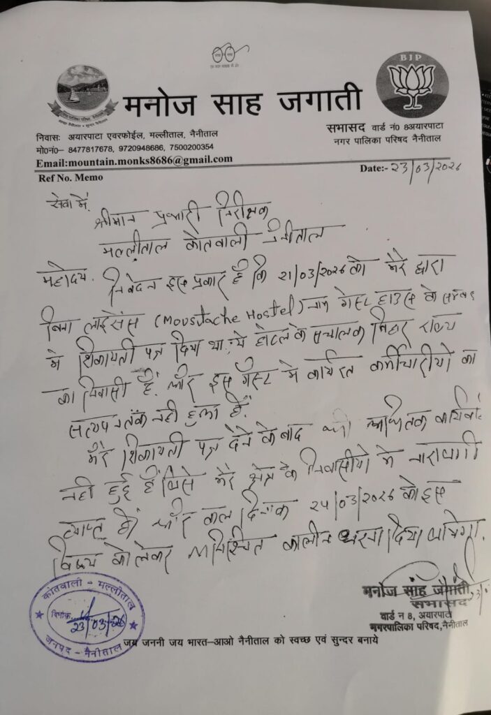नैनीताल।अयारपाटा वार्ड के सभासद मनोज साह जगाती ने मल्लीताल कोतवाली में ज्ञापन देते हुए कहा है कि उनके क्षेत्र में अवैध रूप से गेस्ट हाउस का संचालन किया जा रहा है जिसमे कार्यरत कर्मचारियों का सत्यापन भी नही किया है।गेस्ट हाउस के नीचे सड़क पर गाड़िया खड़ी रहती है जिसजे लोगो को काफी फजीहत उठानी पड़ रही है।कहा कि जब उन्होंने गेस्ट हाउस संचालक से गाड़ियों को हटाने को कहा तो संचालक उन पर ही आरोप प्रत्यारोप करने लगा।जगाती ने कहा कि पुलिस द्वारा कोई कार्यवाही नही की जा रही है,जिसको लेकर अब वे मंगलवार से अनिश्चितकालीन धरना देंगे।