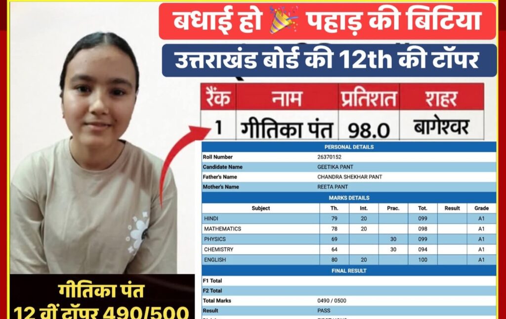 नैनीताल। शनिवार को उत्तराखंड बोर्ड ने 12वीं व 10वीं के परीक्षा परिणाम घोषित कर दिए है जिसमे एक बार फिर से बेटो के मुकाबले बेटियों का दबदबा देझने को मिला है। 12वीं परीक्षा परिणाम में कुमाऊ परिक्षेत्र बागेश्वर के सरस्वती शिशु मंदिर इंटर कॉलेज की गीतिका पंत ने 98 प्रतिदान अंक हासिल कर प्रेदश में पहला स्थान हासिल कर पूरे प्रदेश में बागेश्वर जनपद सहित पूरे पहाड़ का नाम रोशन किया है।