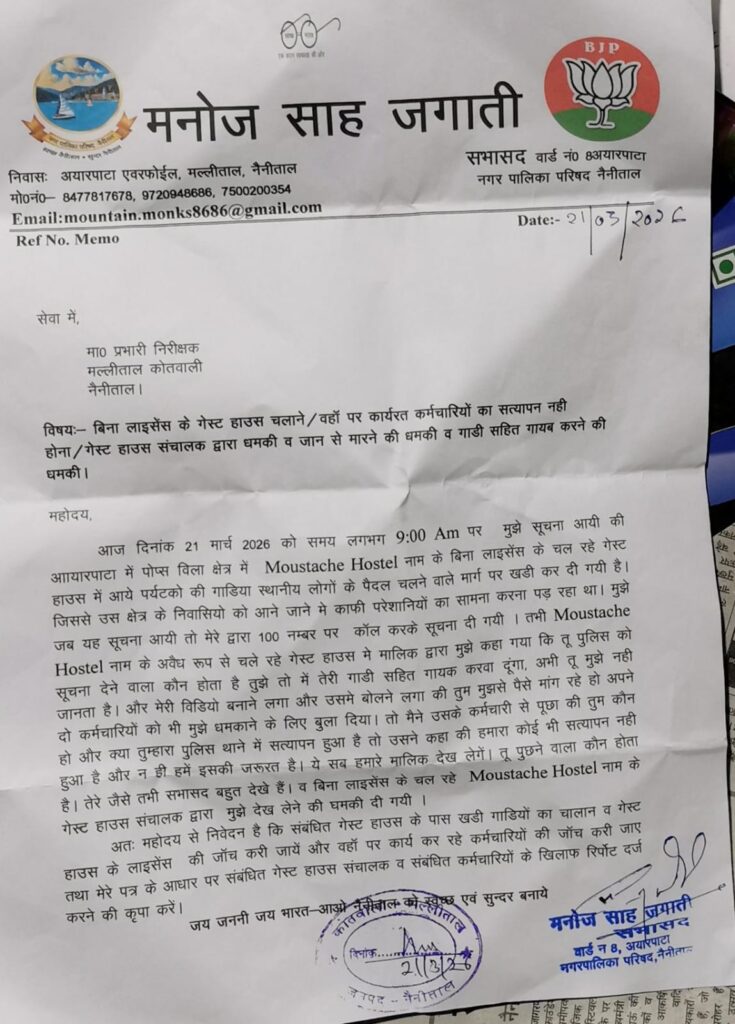 नैनीताल।अयारपाटा वार्ड के सभासद मनोज साह जगाती ने मल्लीताल कोतवाली में ज्ञापन देते हुए कहा है कि उनके क्षेत्र में अवैध रूप से गेस्ट हाउस का संचालन किया जा रहा है जिसमे कार्यरत कर्मचारियों का सत्यापन भी नही किया है।गेस्ट हाउस के नीचे सड़क पर गाड़िया खड़ी रहती है जिसजे लोगो को काफी फजीहत उठानी पड़ रही है।कहा कि जब उन्होंने गेस्ट हाउस संचालक से गाड़ियों को हटाने को कहा तो संचालक उन पर ही आरोप प्रत्यारोप करने लगा।