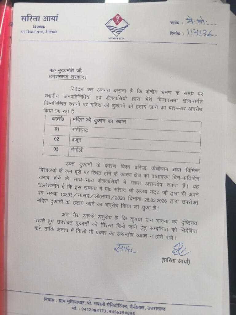 नैनीताल।विधायक सरिता आर्य ने बुधवार को देहरादून में मुख्यमंत्री पुष्कर सिंह धामी को ज्ञापन सौपते हुए नैनीताल विधानसभा के मंगोली,बजून व रातीघाट से शराब की दुकानों को हटाने की मांग की है।विधायक सरिता ने कहा कि क्षेत्र भृमण के दौरान क्षेत्रवासियों ने उनसे उक्त स्थानों से शराब की दुकानों को हटाने की मांग की है।क्योंकि इन स्थानों पर मंदिर की दुकानों के चलते विश्वविख्यात कैंची धाम मंदिर,व स्कूलों से कम दूरी होने के चलते इसका विपरीत प्रभाव पड़ रहा है।जिससे आस पास का वातावरण खराब होने के साथ साथ लोगो में भी असंतोष बना हुआ है।जबकि इन दुकानों को हटाने की मांग सांसद अजय भट्ट द्वारा भी कहा गया है।इसलिए जनहित की भावना को ध्यान में रखते हुए इनको निरस्त किए जाने का कष्ट करें।