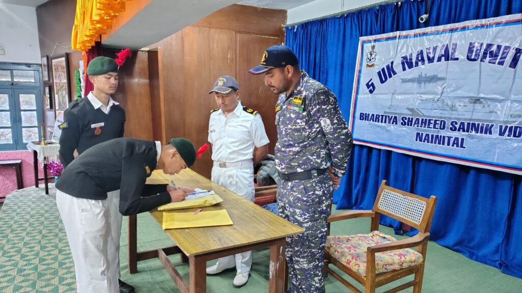नैनीताल। रविवार को भारतीय शहीद सैनिक विद्यालय में एनसीसी 5 यूके नेवल नैनीताल के तत्वाधान में ए सर्टिफिकेट एग्जाम का आयोजन किया गया जिसमें 22 बच्चों ने प्रतिभाग किया कमांडिंग ऑफिसर कैप्टन मृदुल शाह सभी बच्चों को शुभकामनाएं दी और एग्जाम का अवलोकन किया और भारतीय शहीद सैनिक विद्यालय के प्रधानाचार्य बिशन सिंह मेहता ने सभी बच्चों को शुभकामनाएं देते हुए उनको मार्गदर्शन किया और इस A सर्टिफिकेट एक्जाम के लिए मार्गदर्शन किया। सुबह 8:00 बजे से एग्जाम शुरू करने की प्रक्रिया शुरू की 24 जनवरी 2026 को सभी कैडेट्स का प्रैक्टिकल कराया गया और 25 तारीख को इन बच्चों का लिखित एग्जाम कराया गया।जिसमें एनसीसी एएनओ गोविंद सिंह बोरा और सागर सिंह व नेवल विंग के स्टाफ पी एस तोमर और रवि कुमार, कुलविंद्र सिंह कन्याल और 5 यूके नेवल के सभी स्टाफ का सहयोग परीक्षा को करने में रहा। परीक्षा का आयोजन पूर्ण रूप से सफल रहा। भारतीय शहीद सैनिक विद्यालय के सभी बच्चों ने परीक्षा में अपना प्रतिभा किया।