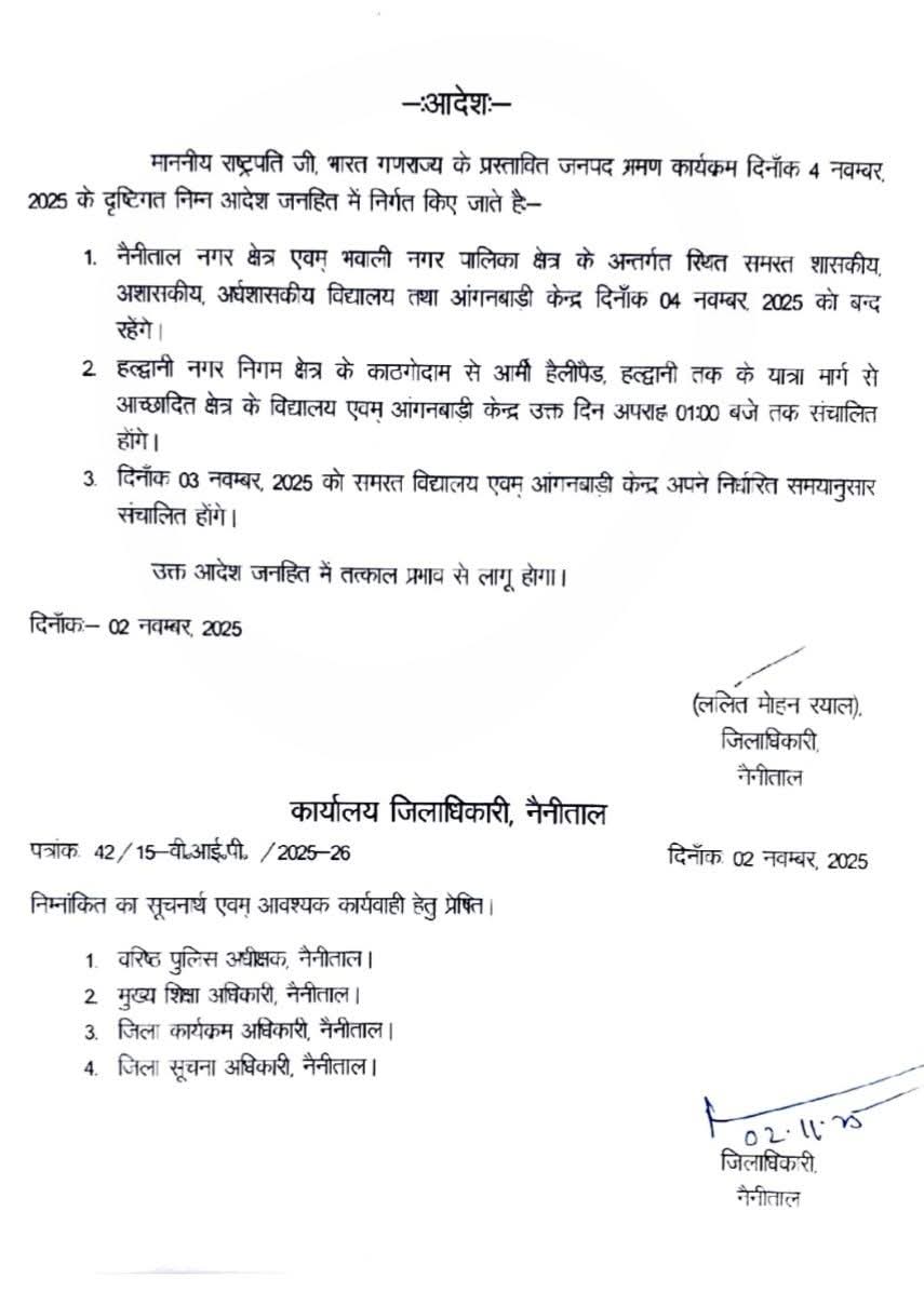 नैनीताल।तीन और चार नवंबर को राष्ट्रपति का नैनीताल दौरा है जिसको लेकर जिलाधिकारी ने 4 नवंबर को भवाली नगर पालिका क्षेत्र तथा नैनीताल नगर के सभी स्कूलों व आंगनबाड़ी केदो में अवकाश की घोषणा की है।