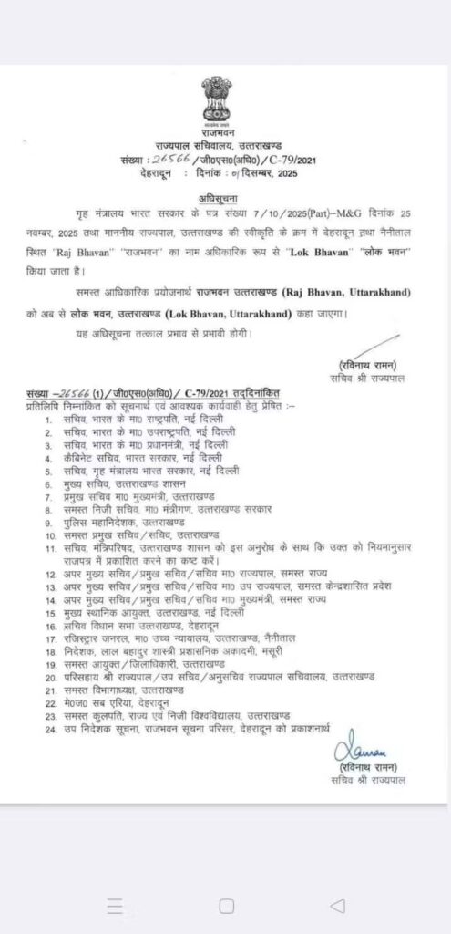 नैनीताल। देहरादून व नैनीताल के ऐतिहासिक राजभवन का नाम अब बदलकर लोक भवन कर दिया गया है। बता दें कि 1897 में नैनीताल राजभवन की नींव रखी गई थी। तीन साल बाद यह भवन बनकर तैयार हुआ। गौथिक शैली में बने इस भवन को लंदन के बकिंघम पैलेस का दर्जा दिया जाता है।