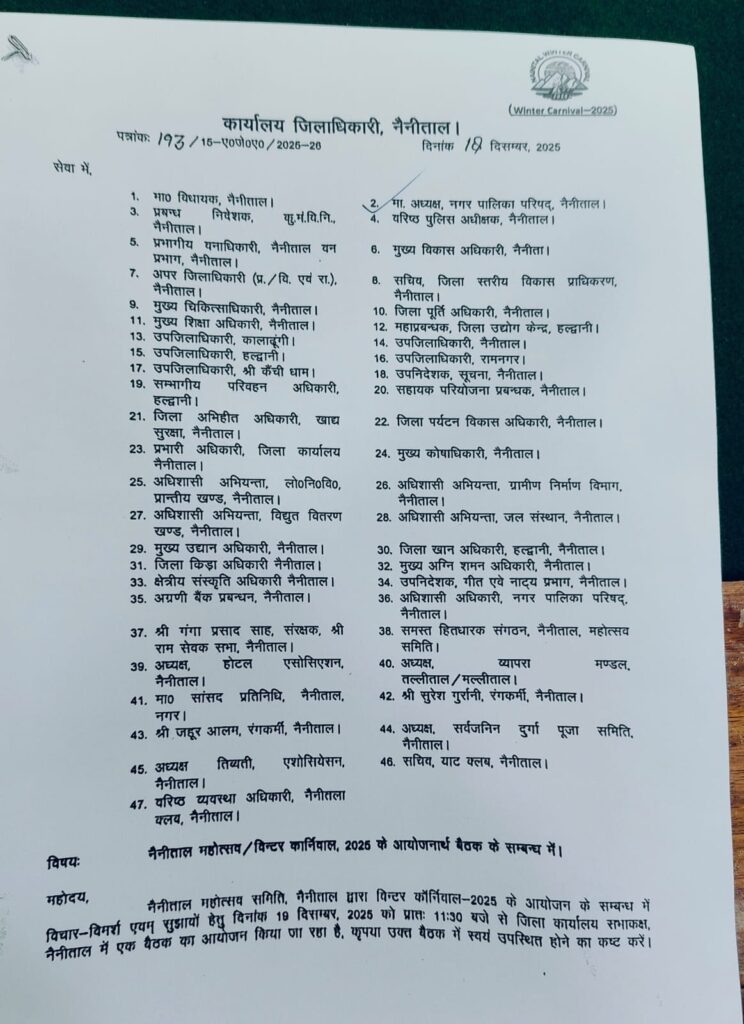 नैनीताल।आगामी 23 से 25 दिसंबर तक आयोजित विंटर कार्निवल को लेकर शुक्रवार को जिलाधिकारी कार्यालय में एक बैठक आयोजित की गई है जिसमें विभागीय अधिकारियों सहित सभी संस्थाओं को आमंत्रित किया गया है।निमंत्रण में रामसेवक सभा के पूर्व संरक्षक स्वर्गीय गंगा प्रसाद साह तथा स्वर्गीय रंगकर्मी सुरेश गुर्रानी के नाम पर भी निमंत्रण भेज दिया गया है।